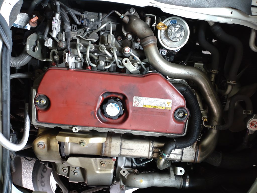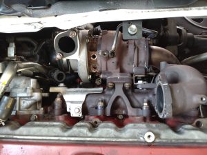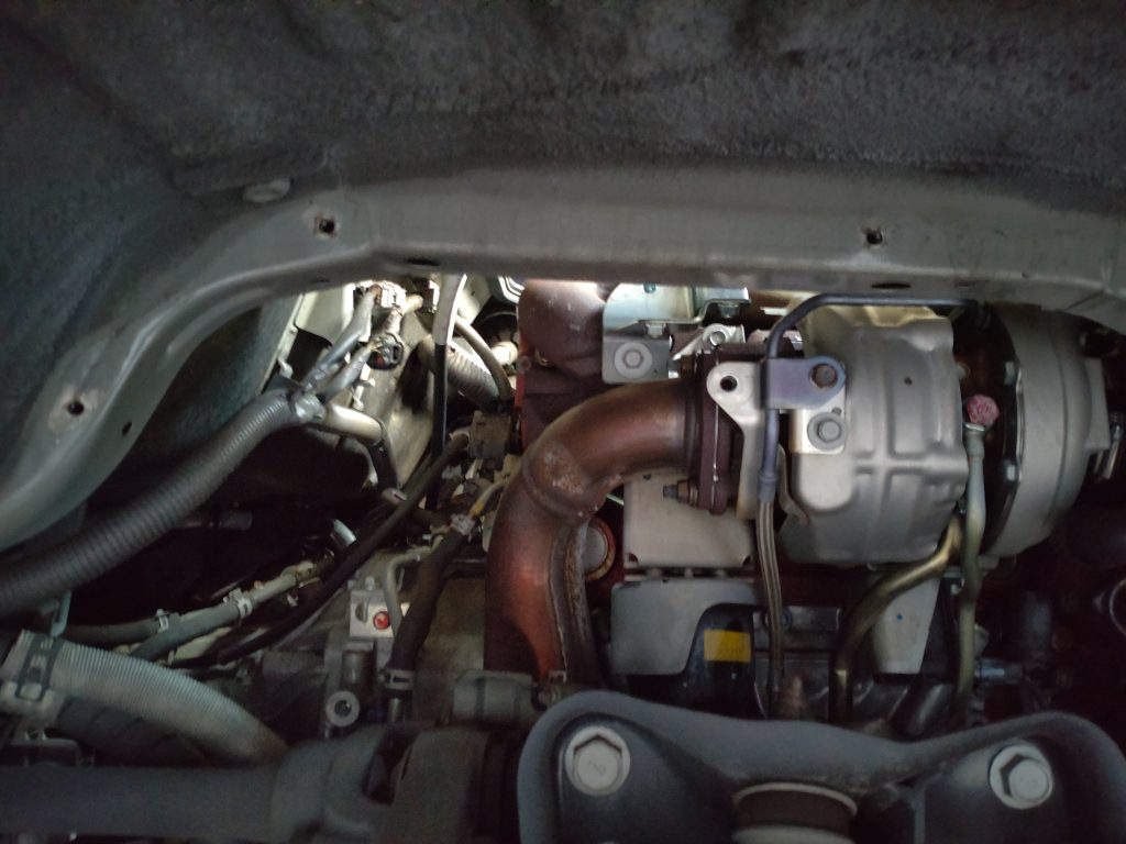 巨大なEGRの配管がエンジン本体の2/3に巻き付いていてターボチャージャー本体は見えますが触れる状況ではありません。上に被さっているものをすべて剥ぎ取る作業となります。エキマニとターボの結合部も全く見えず、手も殆ど入りませんが、ヒートガードを剥がせばターボにアクセス出来そうです。