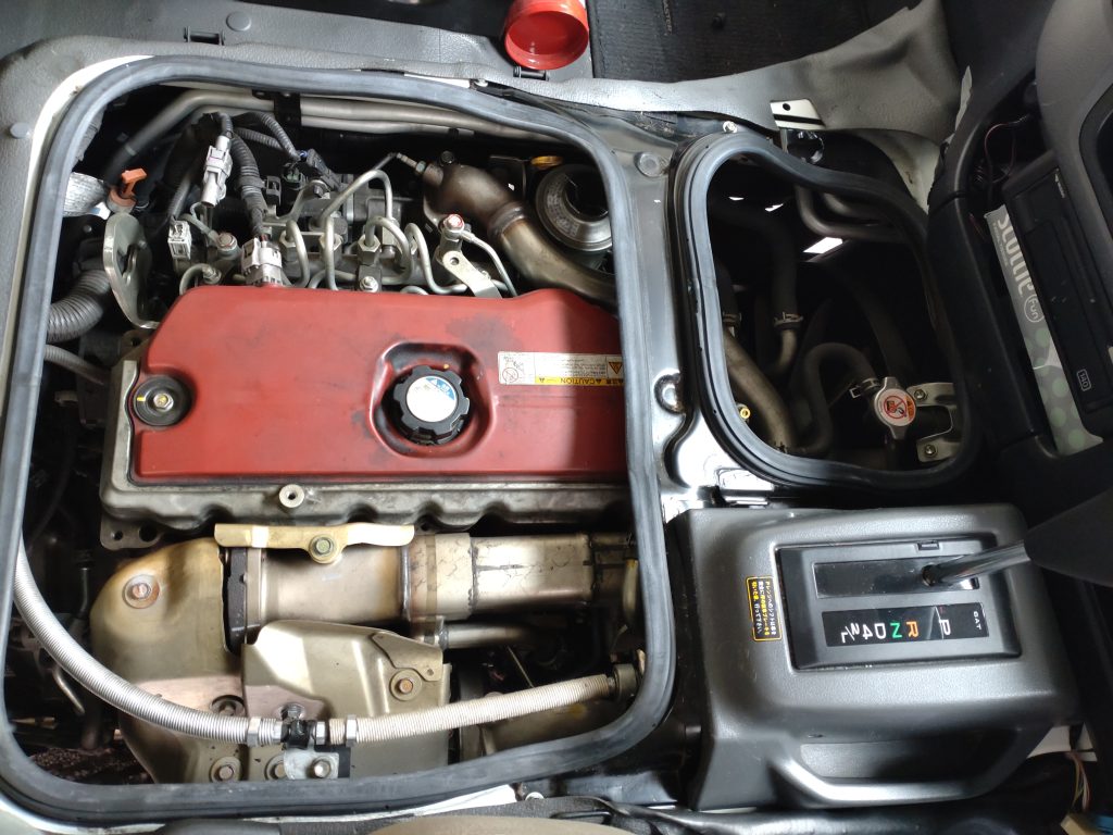 まず、運転席、助手席の間のエンジンサービスホールを全開にします。バンド固定の部分を外し、シフトノブが乗っているパネルも10mmのボルト6本を外して全てはがします。そうすると意外と大きな開口部になりますが、やっぱりマイクロバスの整備性の悪さは変わりません。キャブが前に倒れてエンジン全体が見えるトラックとは全く景色が異なります。
