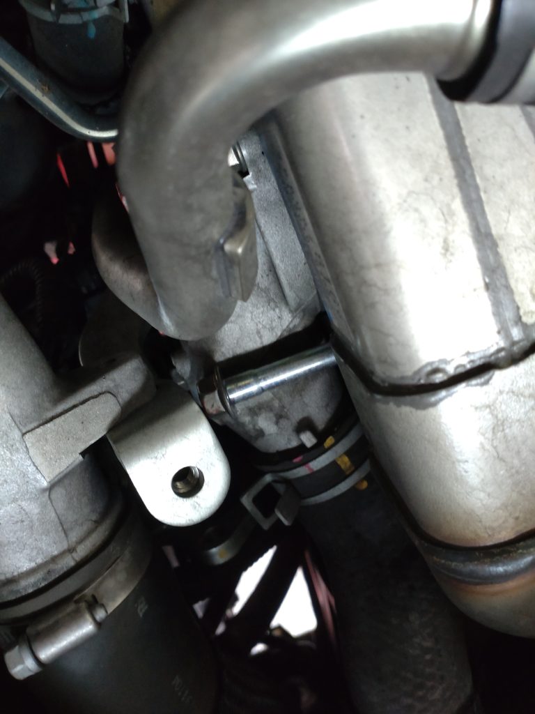 EGRパイプのボディは冷却水ジャケットがある部分の下にある2本のボルトでエンジンブロックにも固定されているので、それを抜きます。