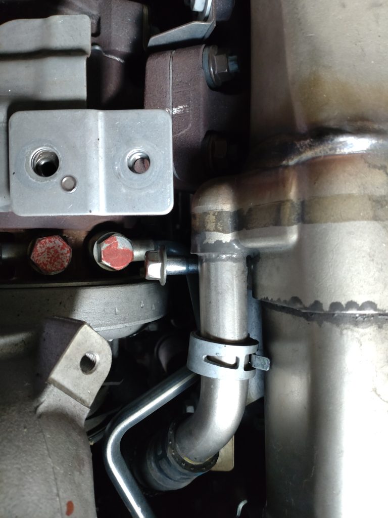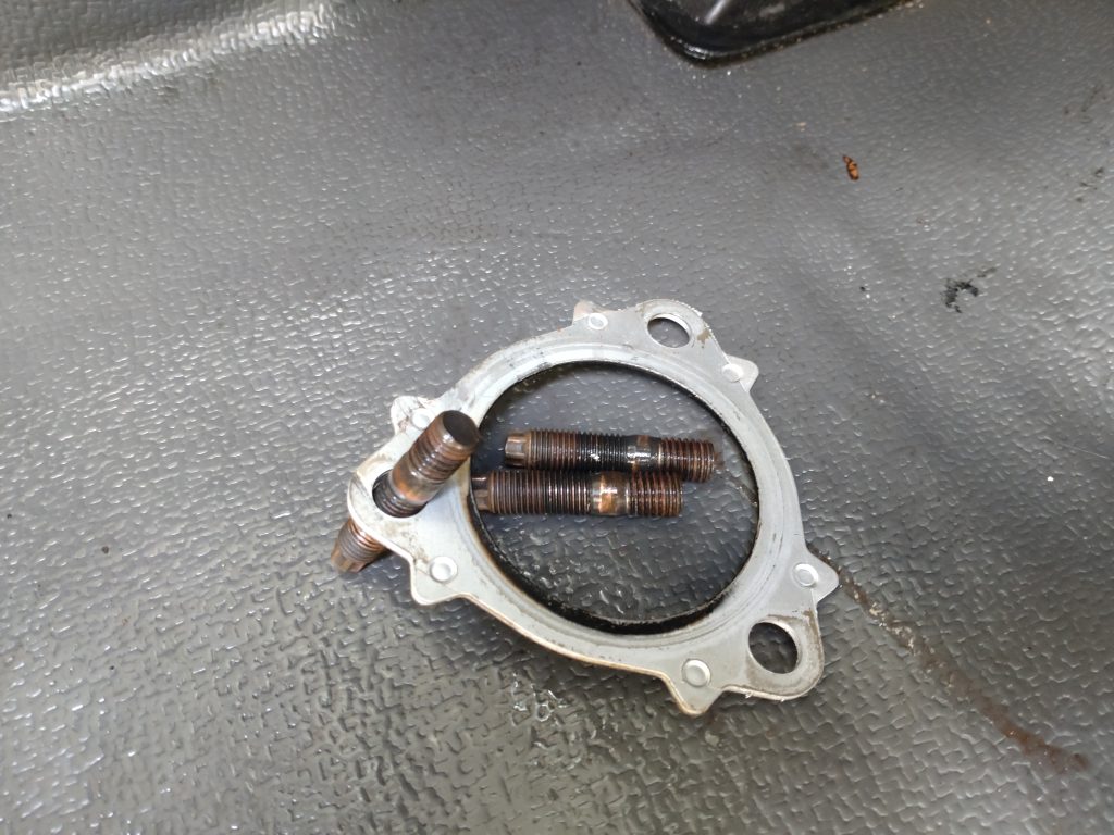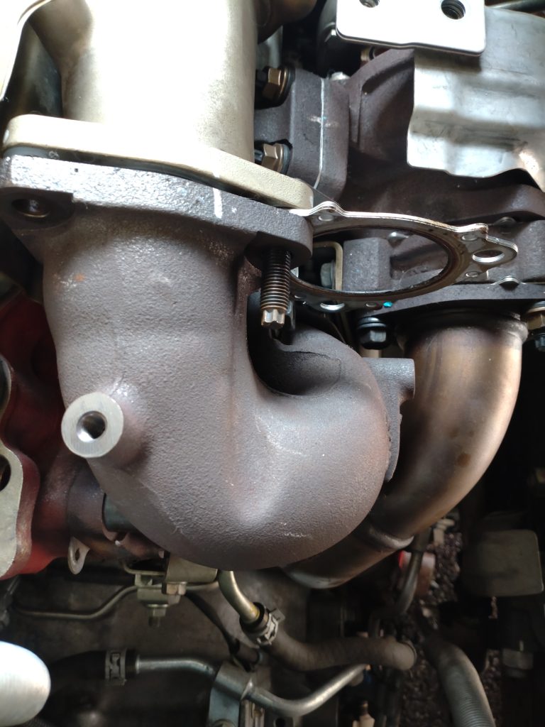 次に、エキマニに取り付けられているEGR取り出しのための鋳物のフロントパイプ?とエンジンを半分取り巻いているEGRのパイプを分離し、取り外していきます。この鋳物のパイプ、エキマニと一体かと思いきや、エキマニに2本にのボルトで連結されていて、後工程で邪魔なので外したいところですが、下側のボルトが排気のフロントパイプと被って工具が入りません。フロントパイプを外した後に外すことにします。